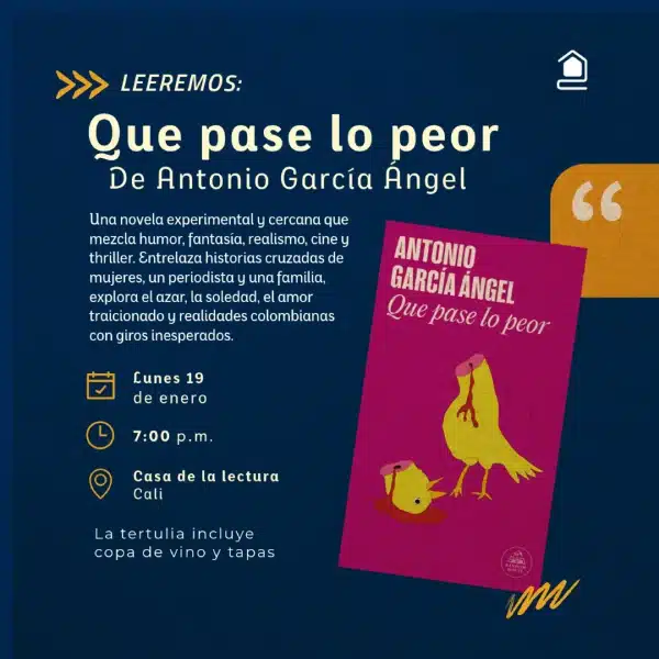 En nuestro Club de Lectura de enero, compartiremos lecturas sobre el título «Que pase lo peor» de Antonio García Ángel, una obra experimental y cercana que mezcla humor, realismo y múltiples voces para hablar de la soledad, el amor traicionado y las realidades colombianas que nos atraviesan.